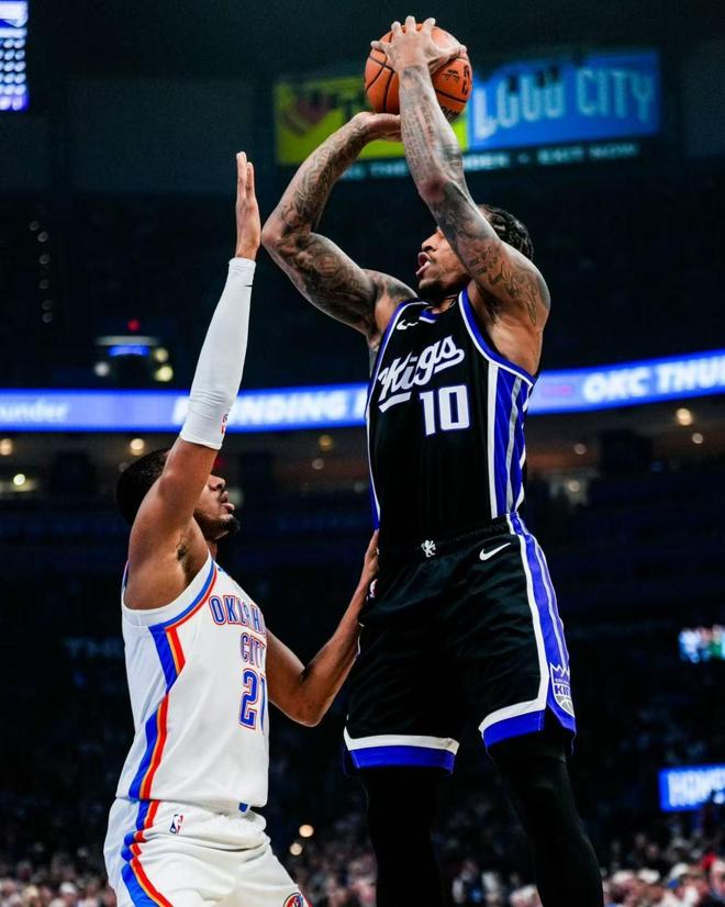 米切尔、多尔特与埃利斯在禁区对轰,米切尔命中三分球。德罗赞背身单打连得5分,蒙克上篮得手,德罗赞低位得分,国王轰出了9比0的攻势。首节打完,雷霆以24比29落后。